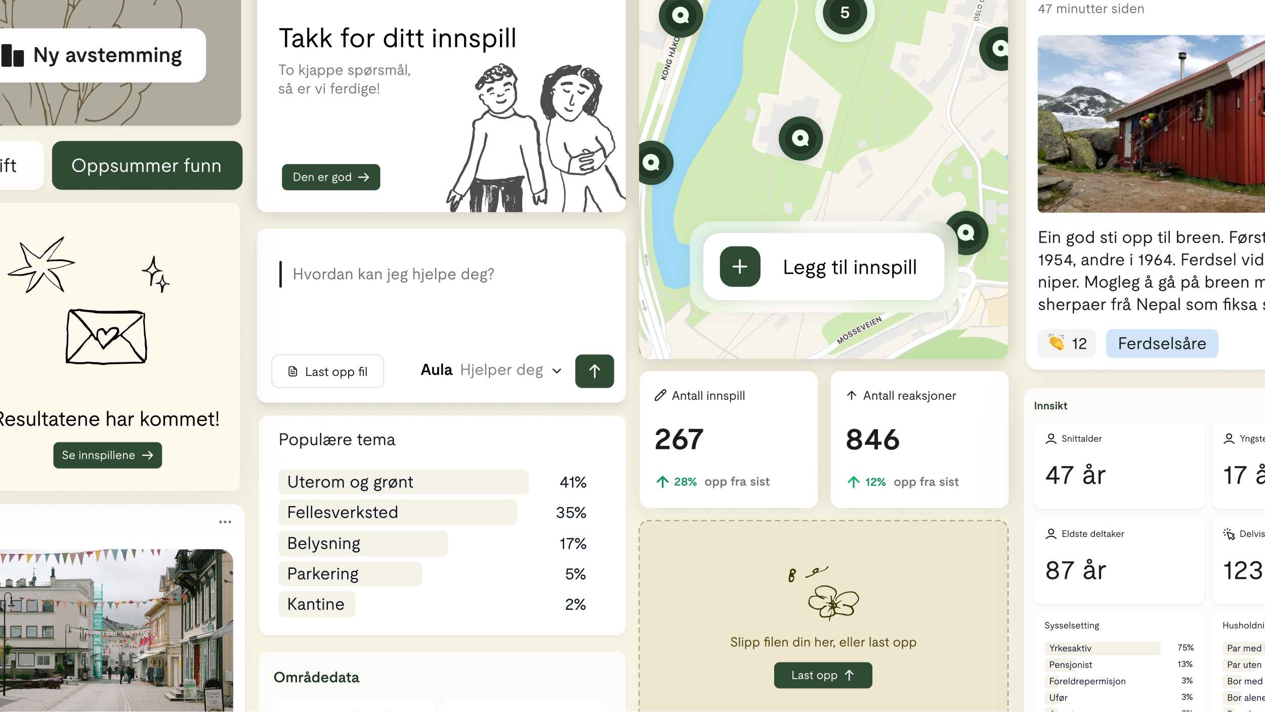 På eget iniativ har vi utviklet Aula, en digital plattform som gjør det enkelt å delta i lokaldemokratiet. Innbyggere kan dele innspill og kunnskap når det passer dem, Aula samler innspill, strukturerer dem og gjør det enkelt å analysere innspillene.
